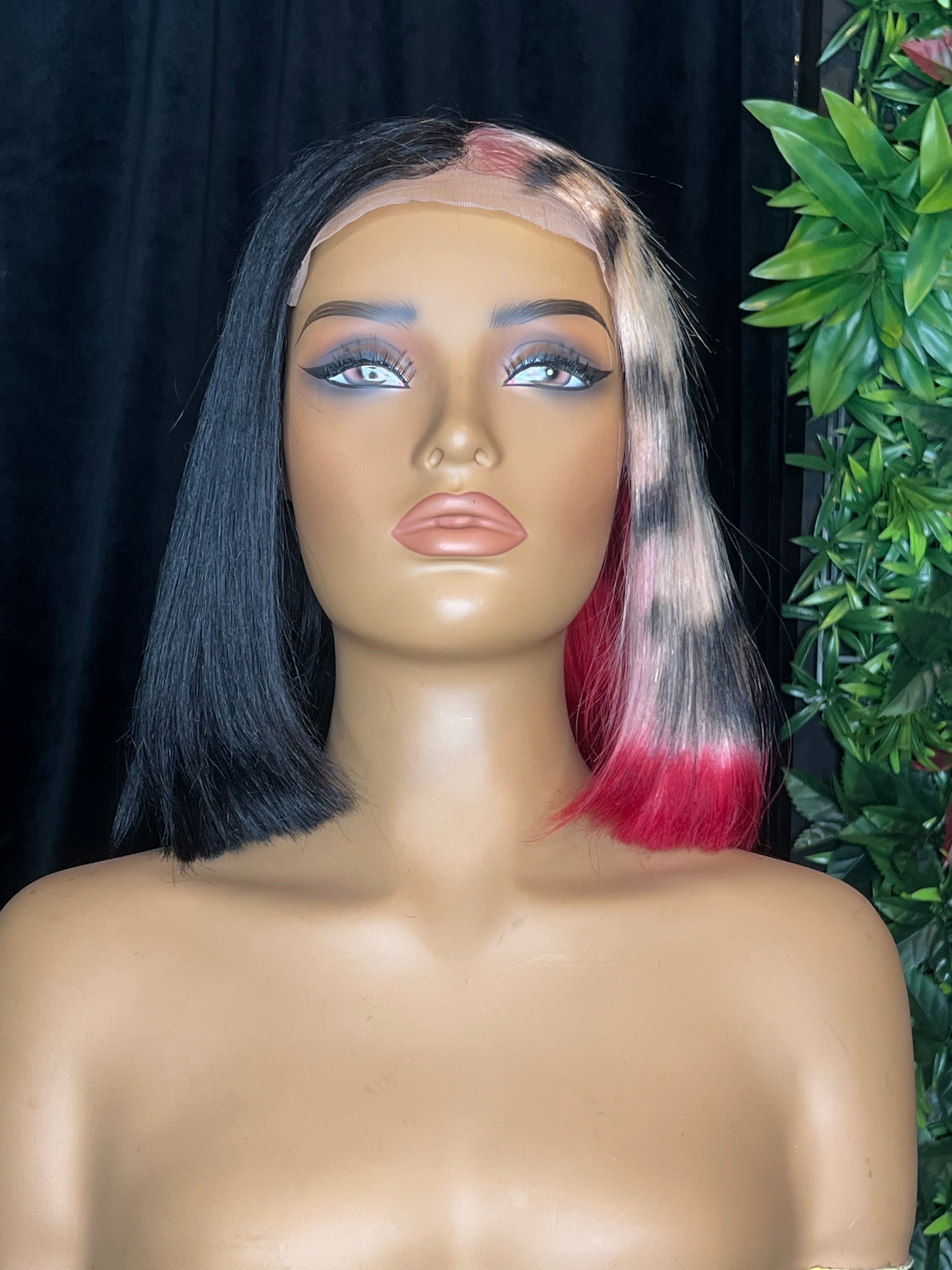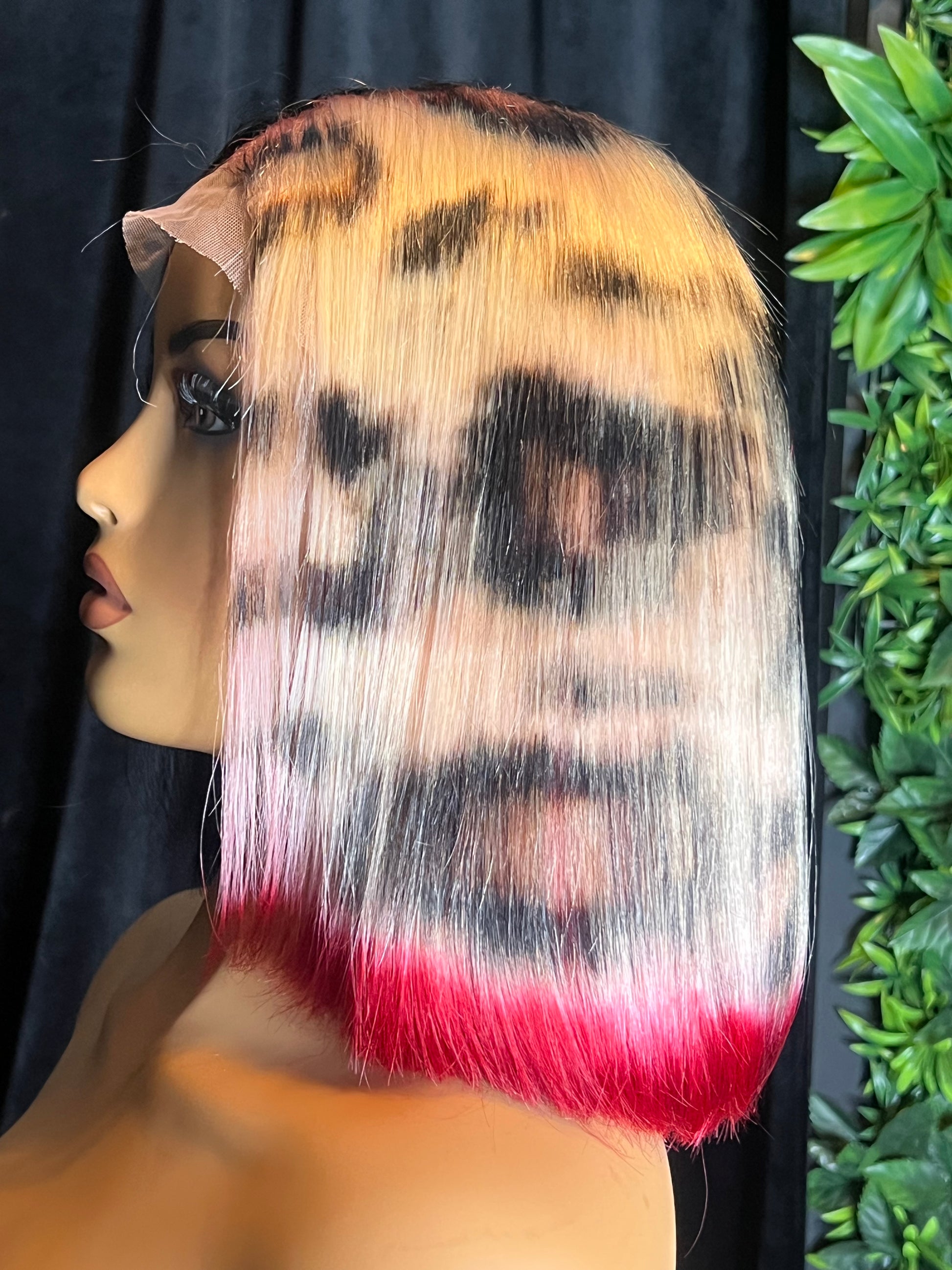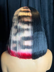 This custom colored bob features a leopard print with red tips on one side, jet black on the other. Seen here is the 5x5 hd lace 12” unit